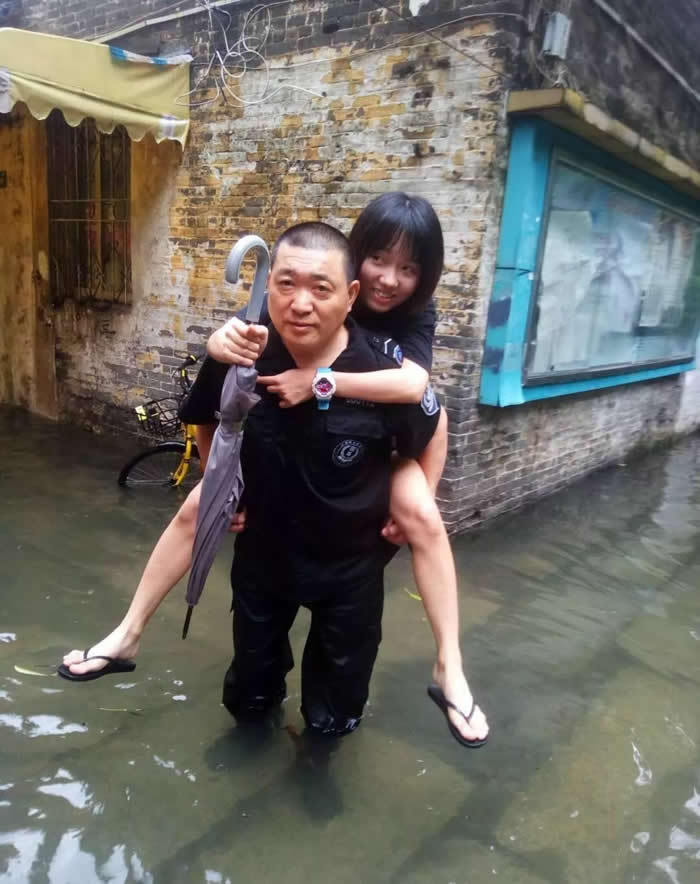強降雨期間,暴雨夾雜著強風,有的路面積水嚴重,有的車輛被困,有的客戶單位廠房滲水,險情不斷。面對危情,白坭城管特勤隊員二話不說,投身到搶險救災(zāi)工作中去。有的疏通交通;有的幫助來往熄火車輛推車;有的背著來往市民淌水過路;還有的疏導(dǎo)排水通道。